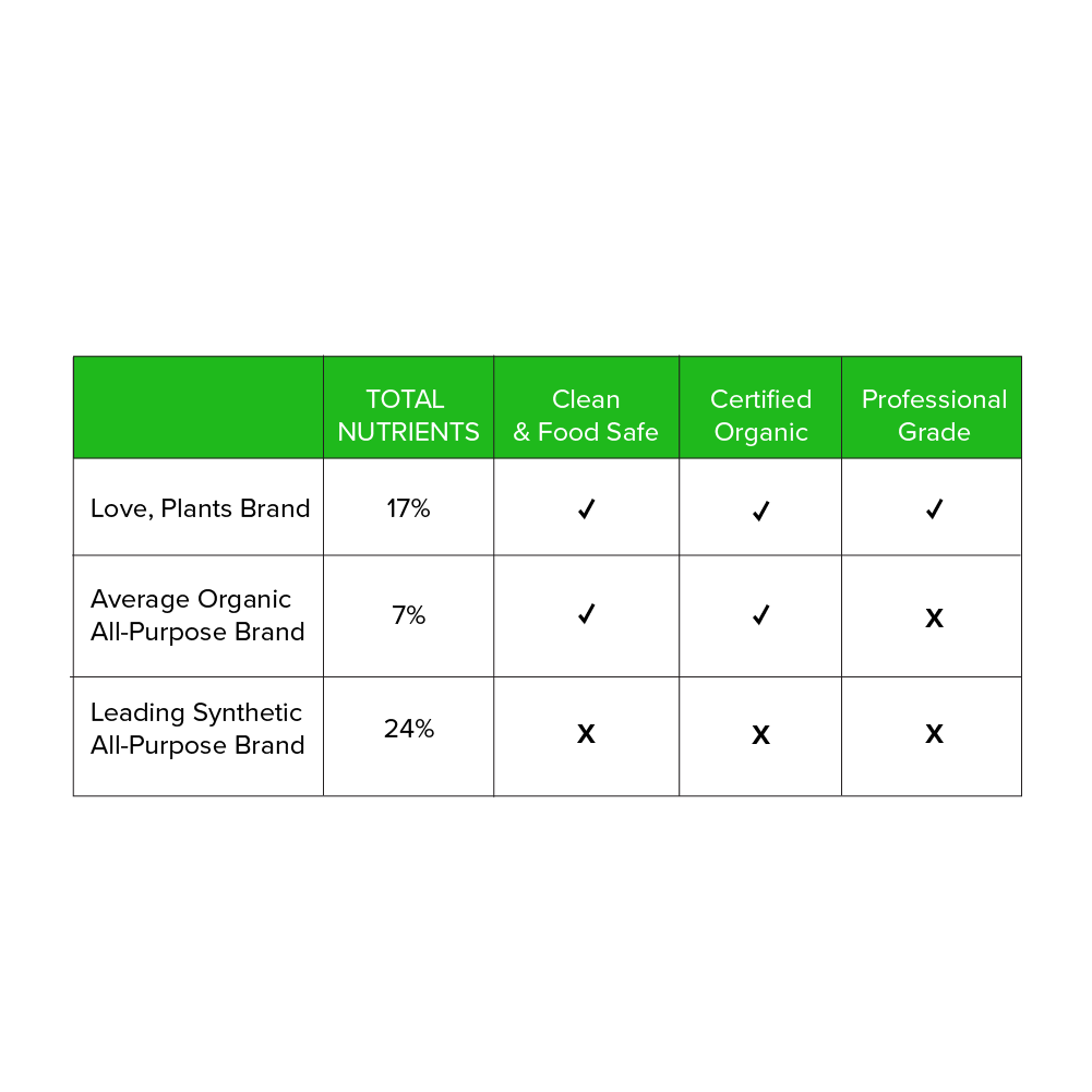 Love, Plants professional fertilizers are over 2x as effective as other organic brands while still being food safe and sustainable.